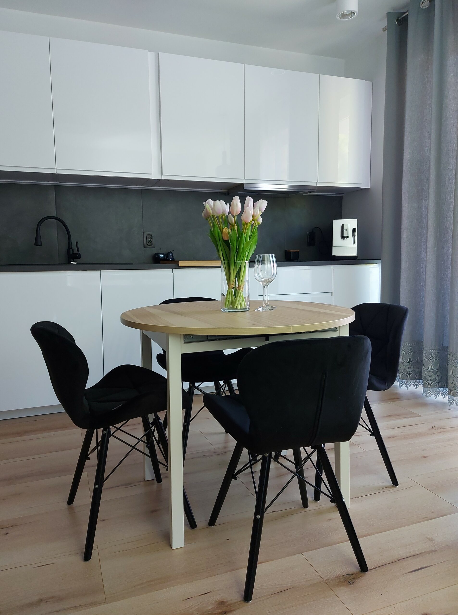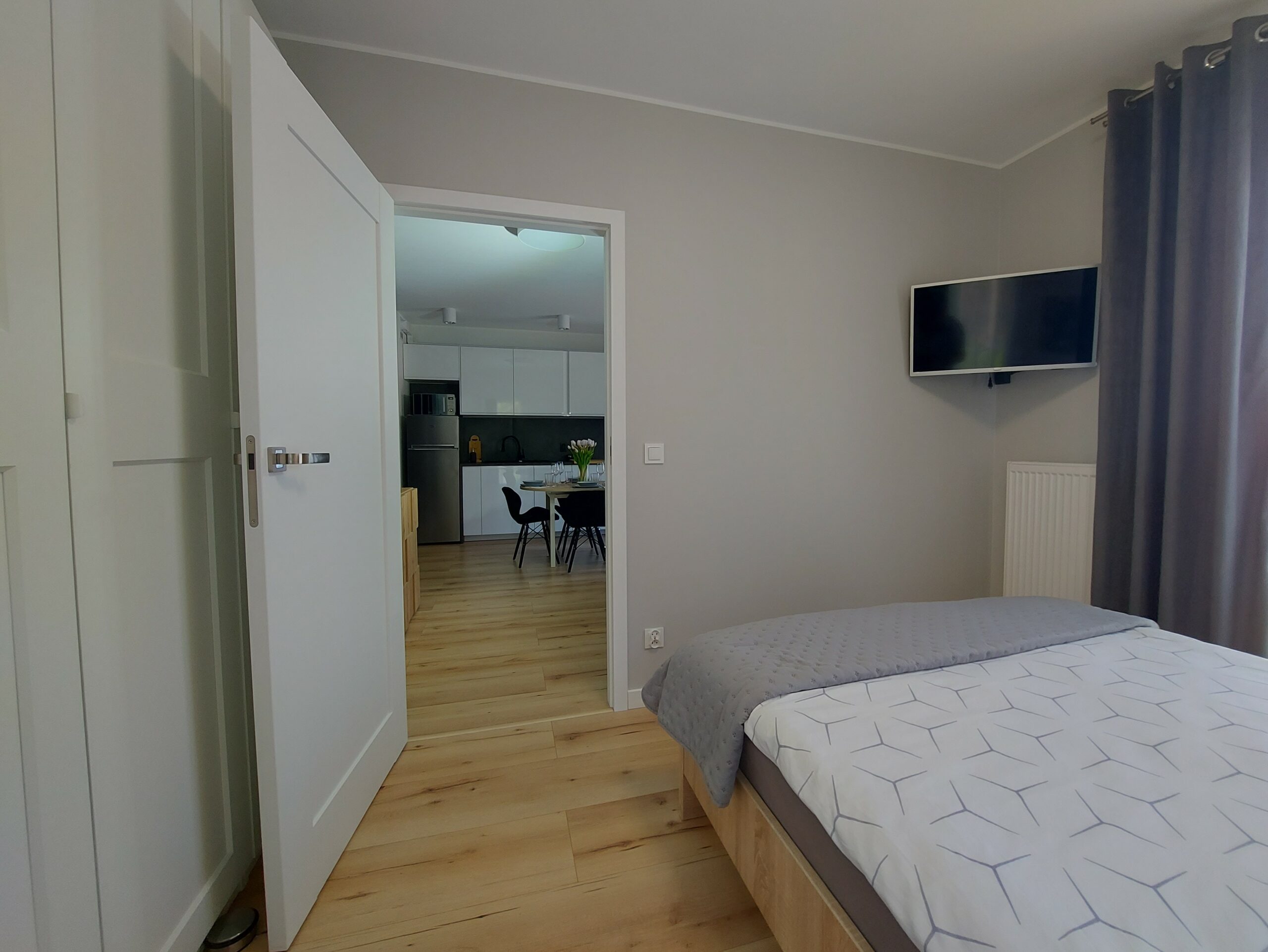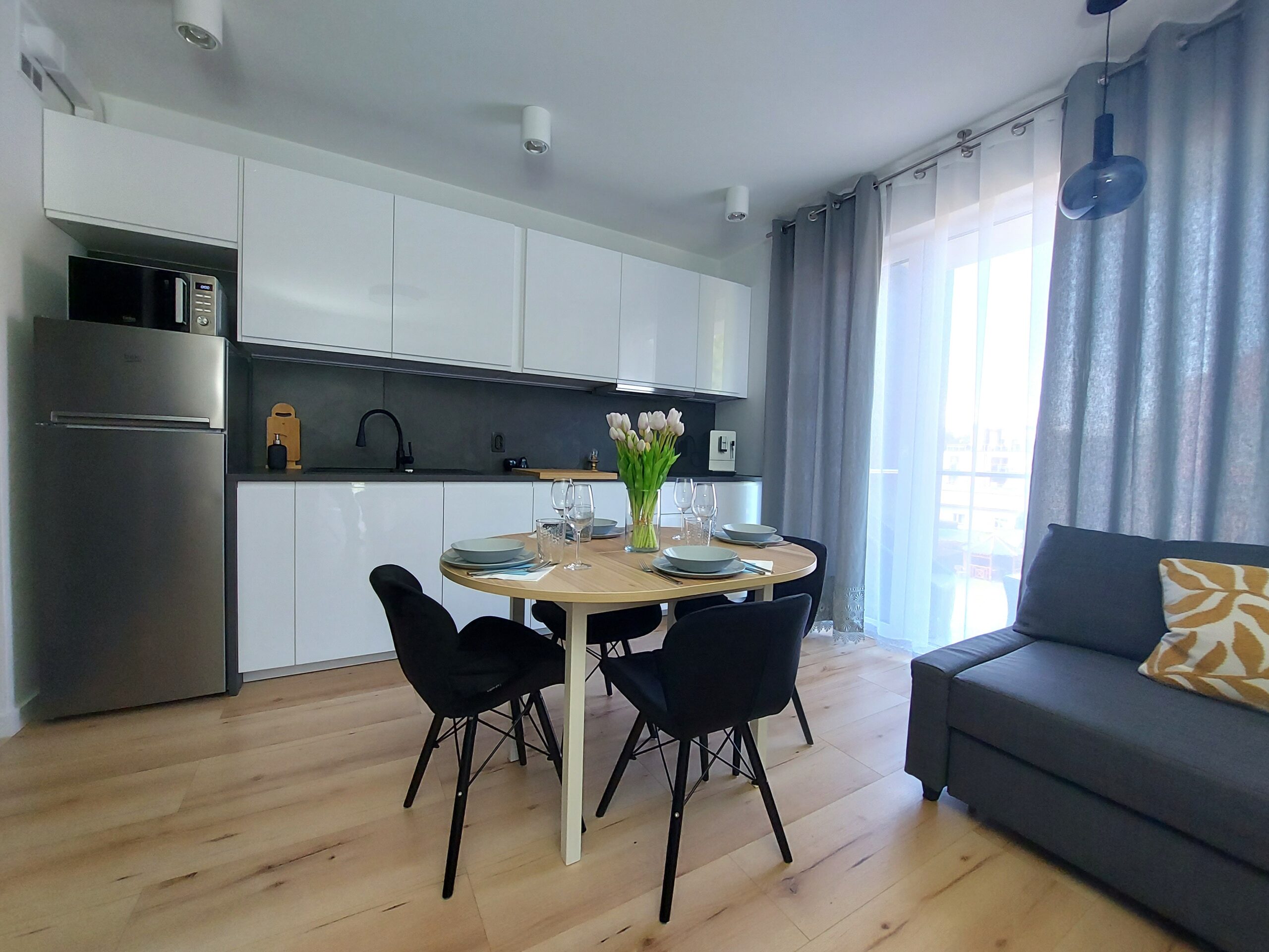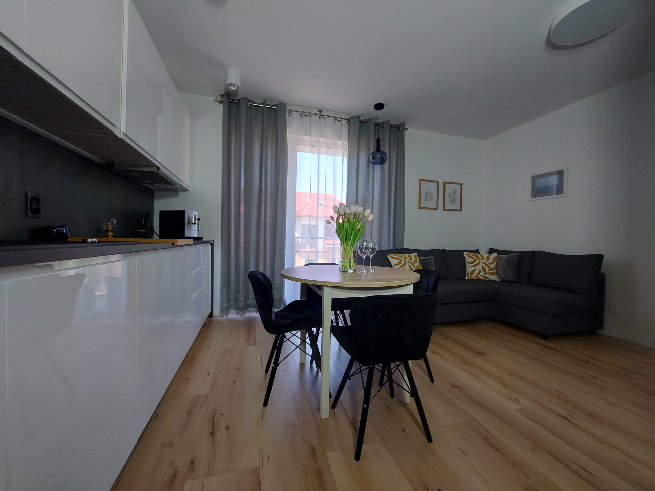 Aneks kuchenny w pełni wyposażony: płyta indukcyjna, lodówka, zmywarka, czajnik, ekspres przelewowy, komplet garnków i patelni, pełna zastawa stołowa, kubki, sztućce i szklanki).