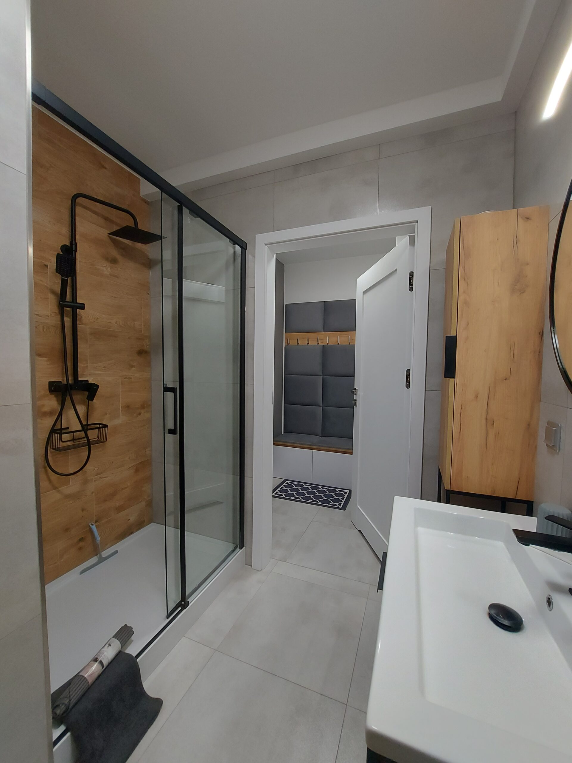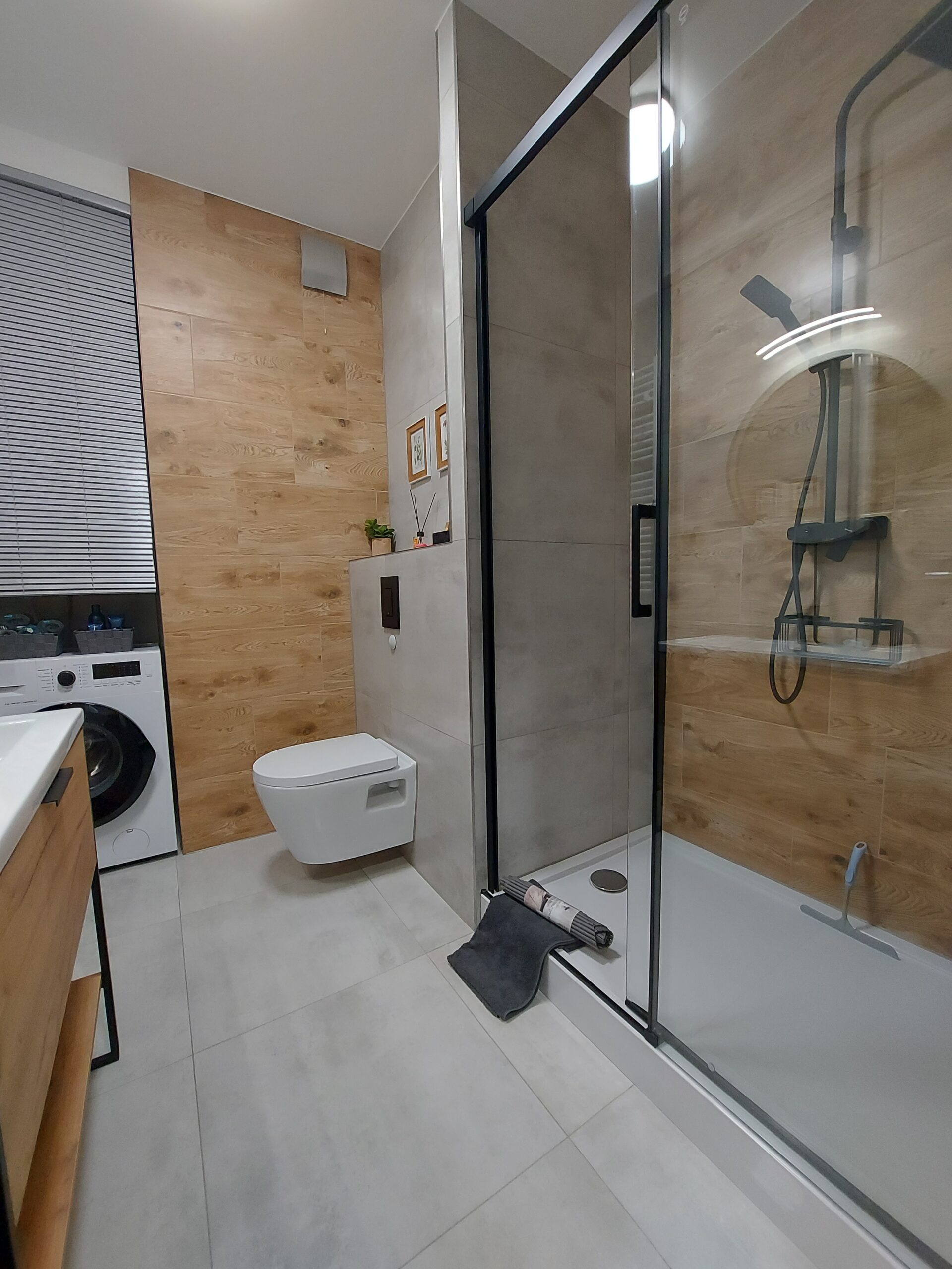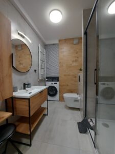 Łazienka z prysznicem, wyposażona jest w pralkę.